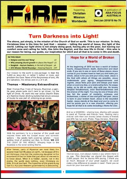 The latest FiRE No78 for December 2018 is now available and contains stories about Religion and the real ‘thing’, why amazing growth in places like Nepal, the despair of asylum seekers in Bankok, and a roundup of of all AFA missions.